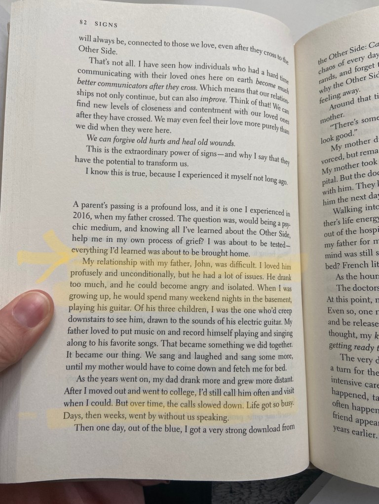 I quickly sent Amy a message back, going “You’re not gonna believe this but…” and I filled her in on what had transpired so far. “I dont wanna spoil anything but late in the book the author talks about her dad, John dying, which is my dads name and…” I gave her the whole rundown.